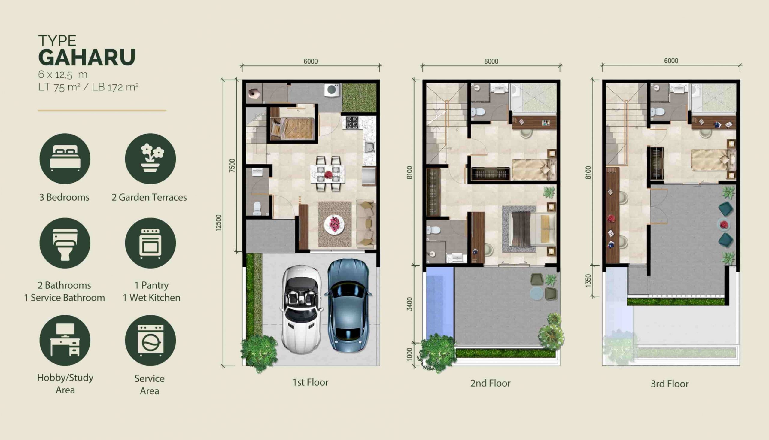 • Gaharu: Luas tanah: 75m2 Luas bangunan: 172m2 Jumlah kamar tidur: 3 kamar Jumlah kamar mandi: 3 kamar